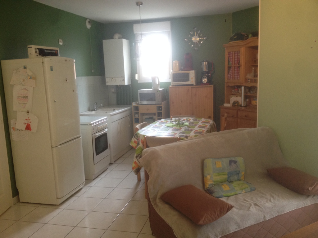 Entrée, séjour donnant sur le balcon, cuisine ouverte, wc, chambre et salle de bains.