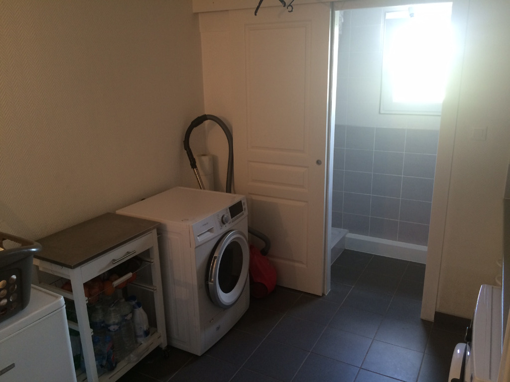Grand garage motorisé, buanderie et douche.
